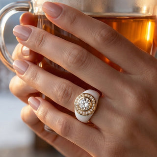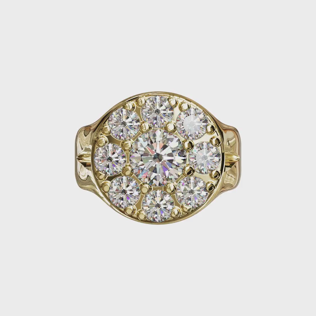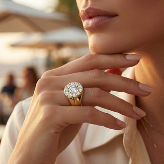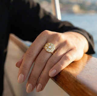 Sculptée en or 18 carats 750/1000, sa silhouette généreuse et arrondie évoque la force d’une chevalière, tout en affirmant une féminité assumée. Portée à l’annulaire ou au majeur, DAISY impose sa présence, une fleur qui ne murmure pas, elle brille.