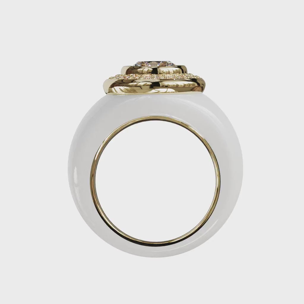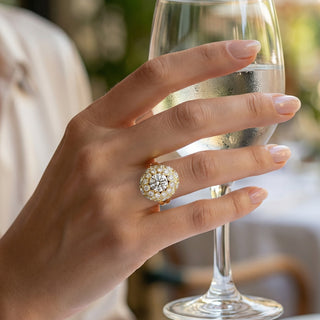 Le grand modèle de la bague ÉCLORA célèbre la lumière sous toutes ses formes. Son volume généreux, entièrement pavé de diamants, rayonne autour d’une pierre centrale d’exception, mise en majesté par un dôme d’or aux lignes organiques.