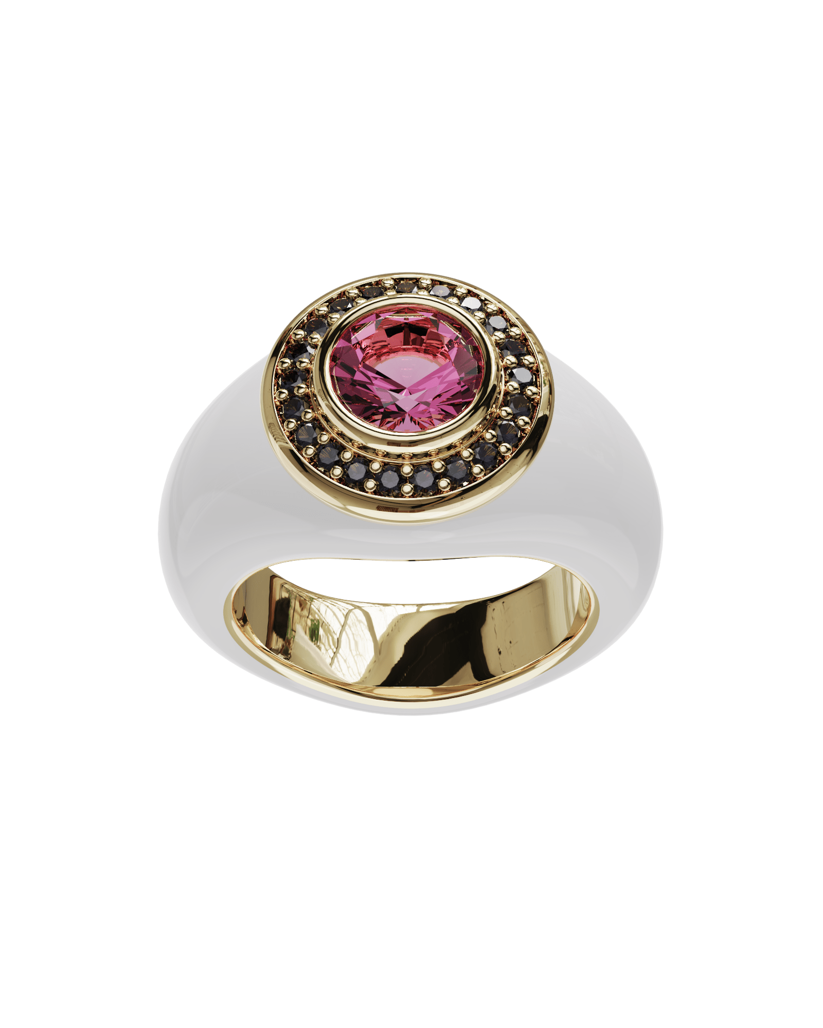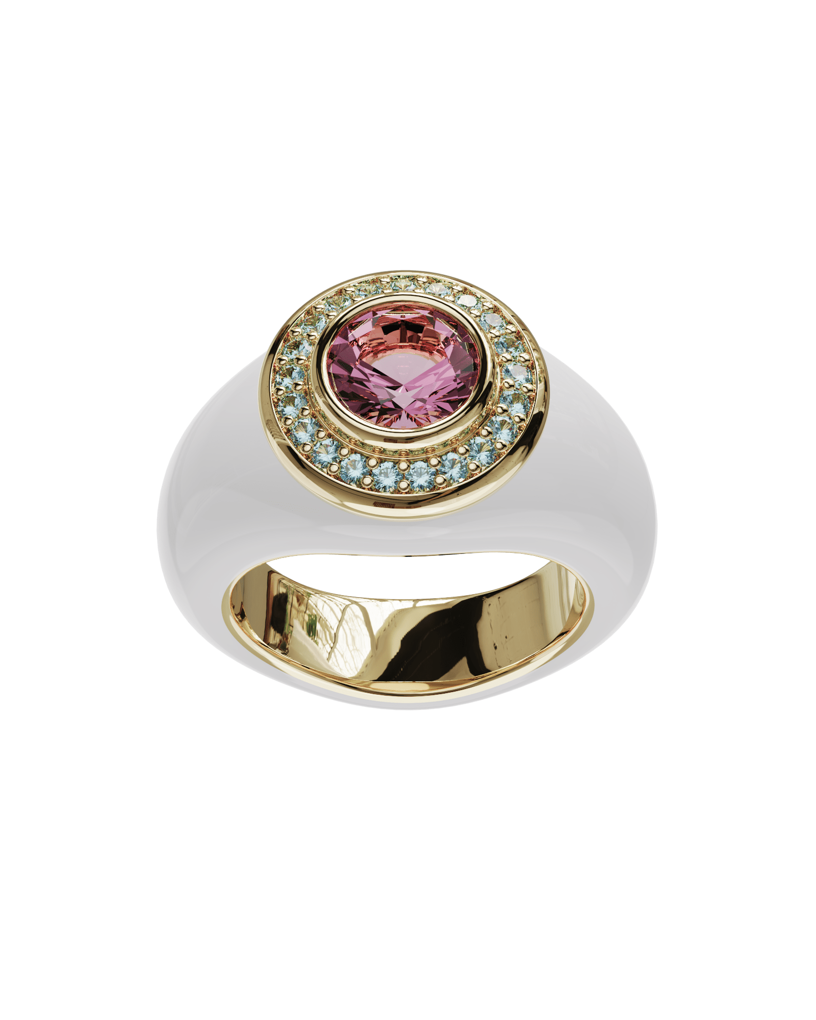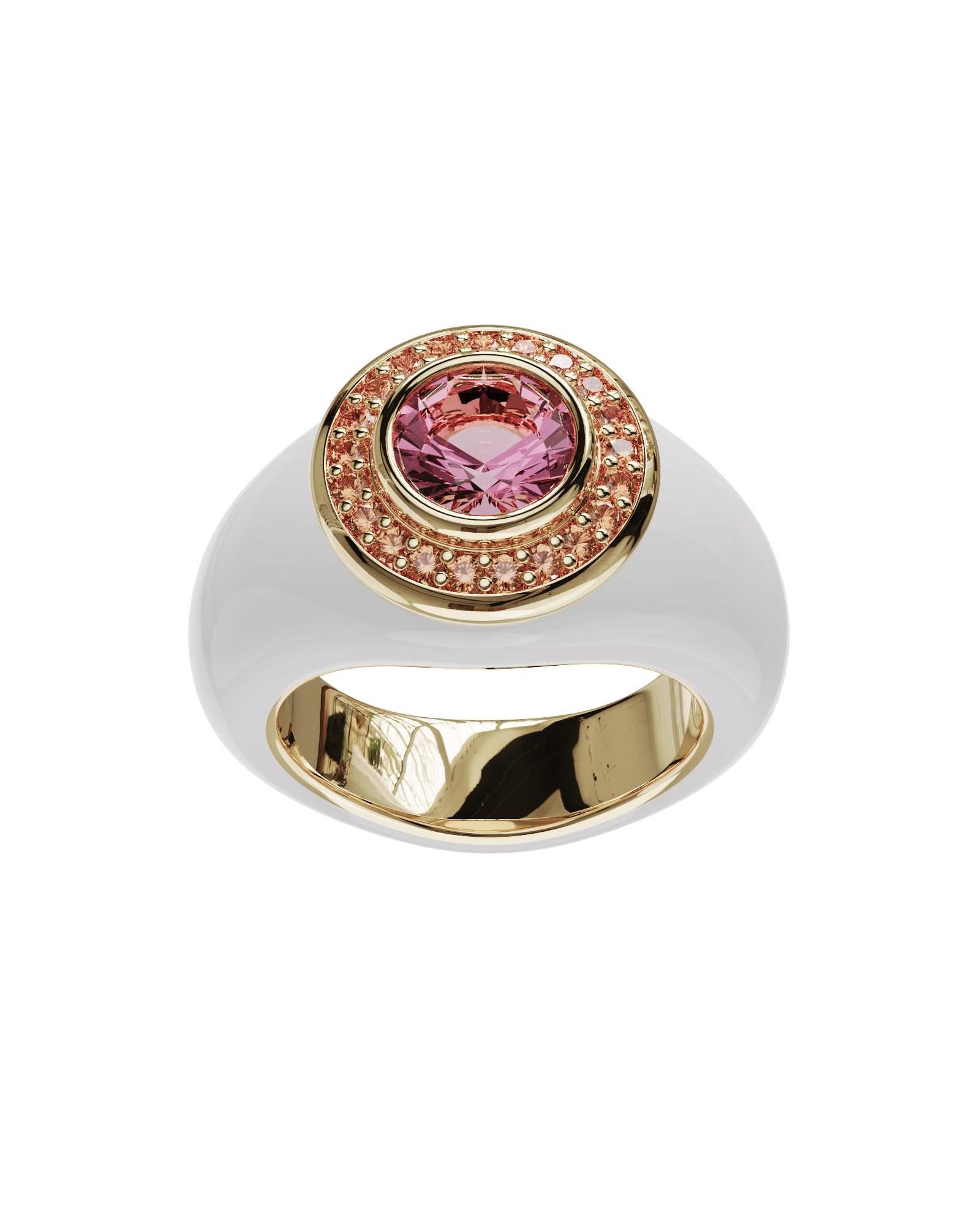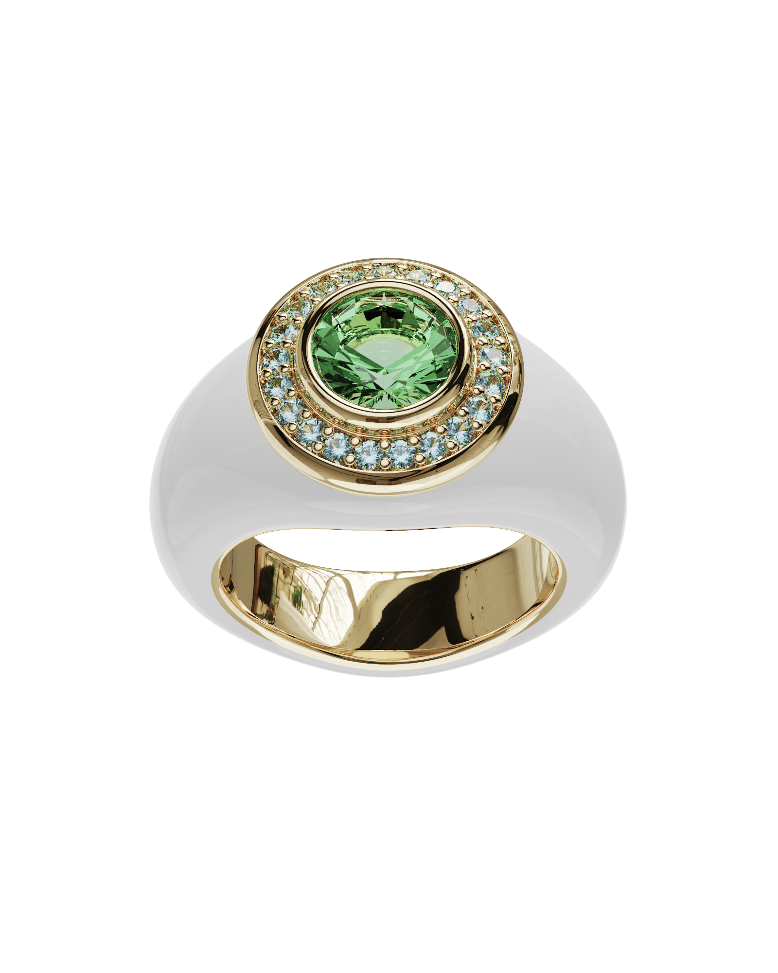 Spécifications : Or 750/1000 9.0gr, Diamant de synthèse Central Rond de 1.5 Ct, de diamètre 7.44mm entouré de 21 diamants de synthèse de 0.12Ct soit 4.02Ct total