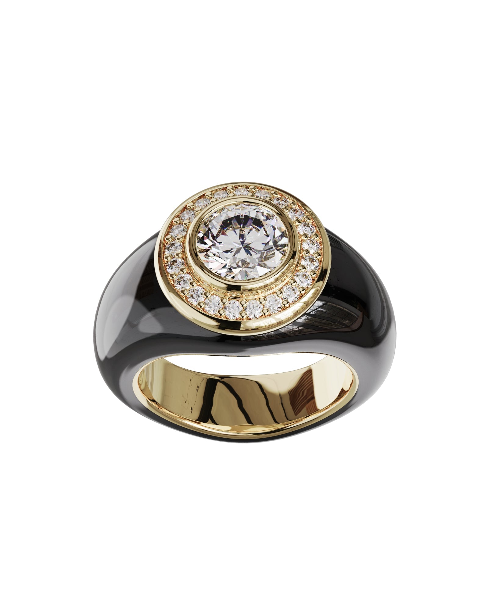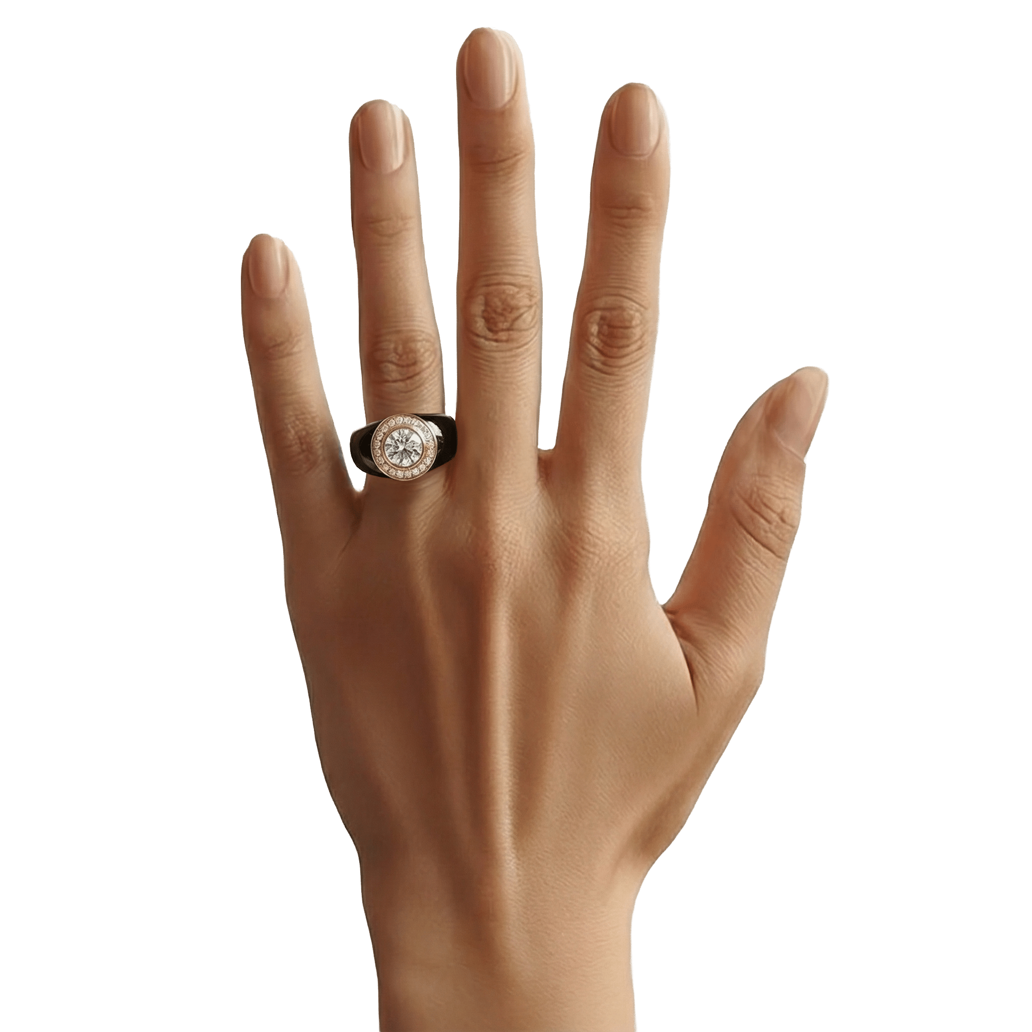 Spécifications : Or 750/1000 9.0gr, Diamant de synthèse Central Rond de 1.5 Ct, D, VS+ de diamètre 7.44mm entouré de 21 diamants de synthèse de 0.12Ct soit 4.02Ct total