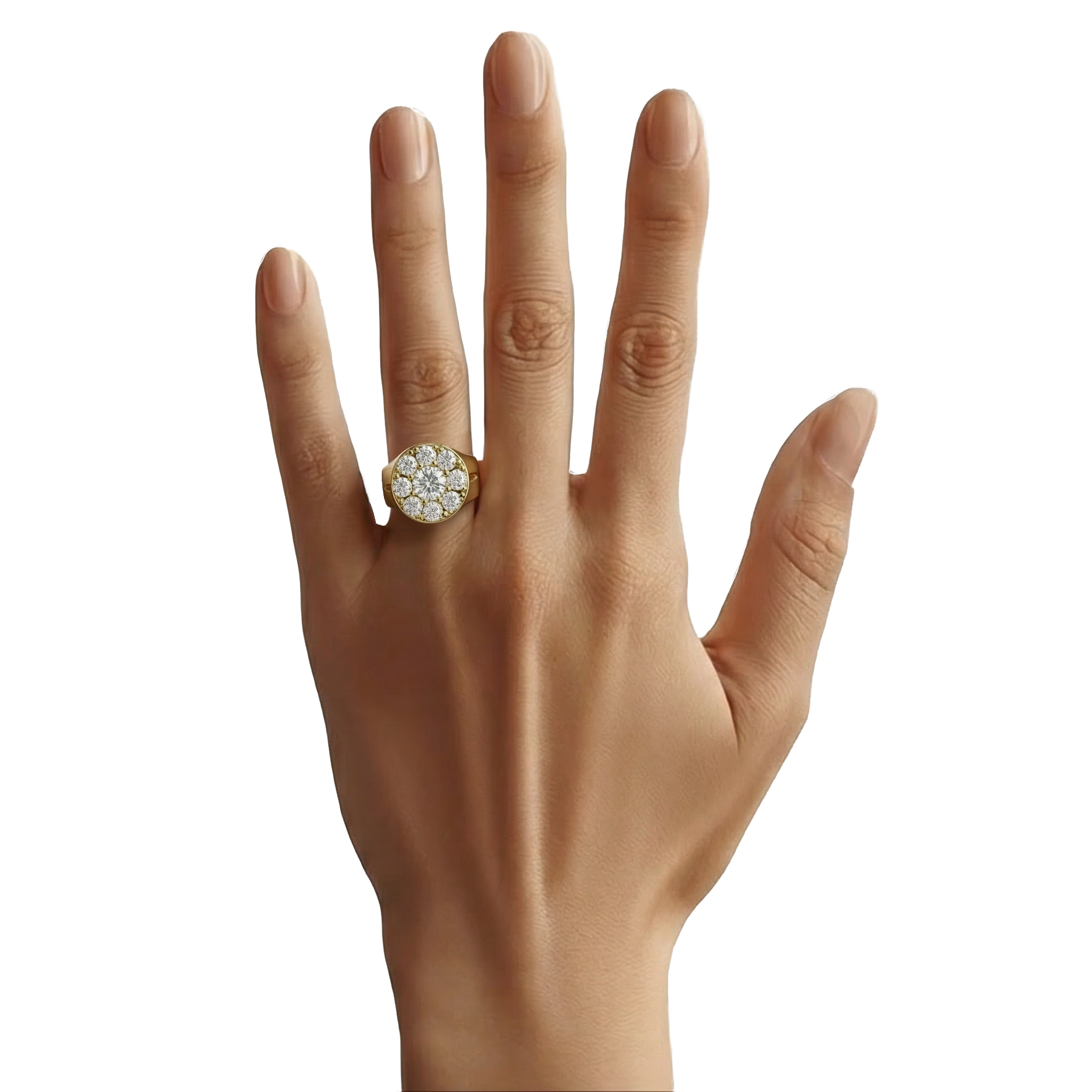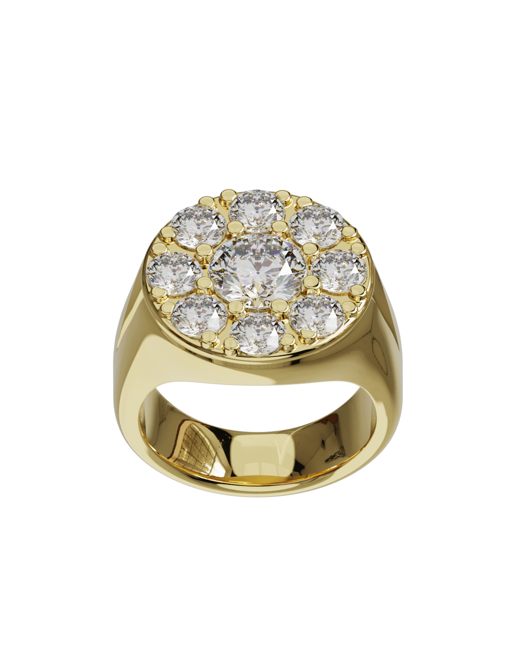 Spécifications : Or 750/1000 10.0gr, Diamant de synthèse Central Rond de 1.0Ct, D, VS+ de diamètre 6.50mm entouré de 8 diamants de synthèse Rond de 0.20Ct soit 2.60Ct total