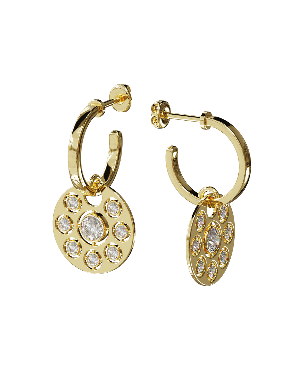 Spécifications : Or 750/1000 7.0gr, 0.92Ct total. Par boucle d'oreille : un Diamant de synthèse Central Rond de 0.22Ct, D, VS+ de diamètre 3.90mm entouré de 8 diamants de synthèse Ronds de 0.03Ct