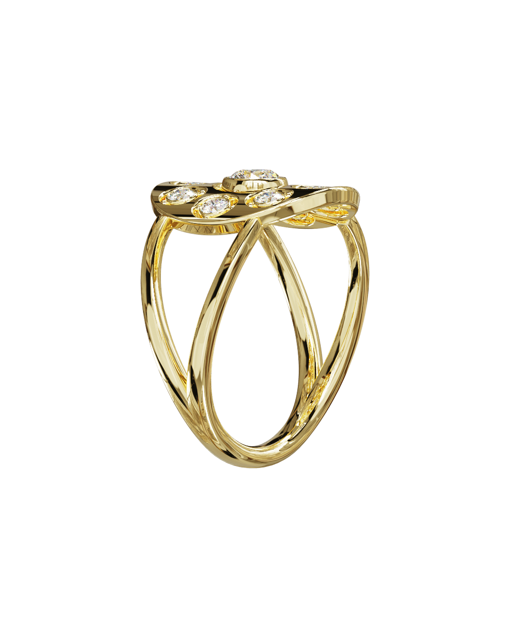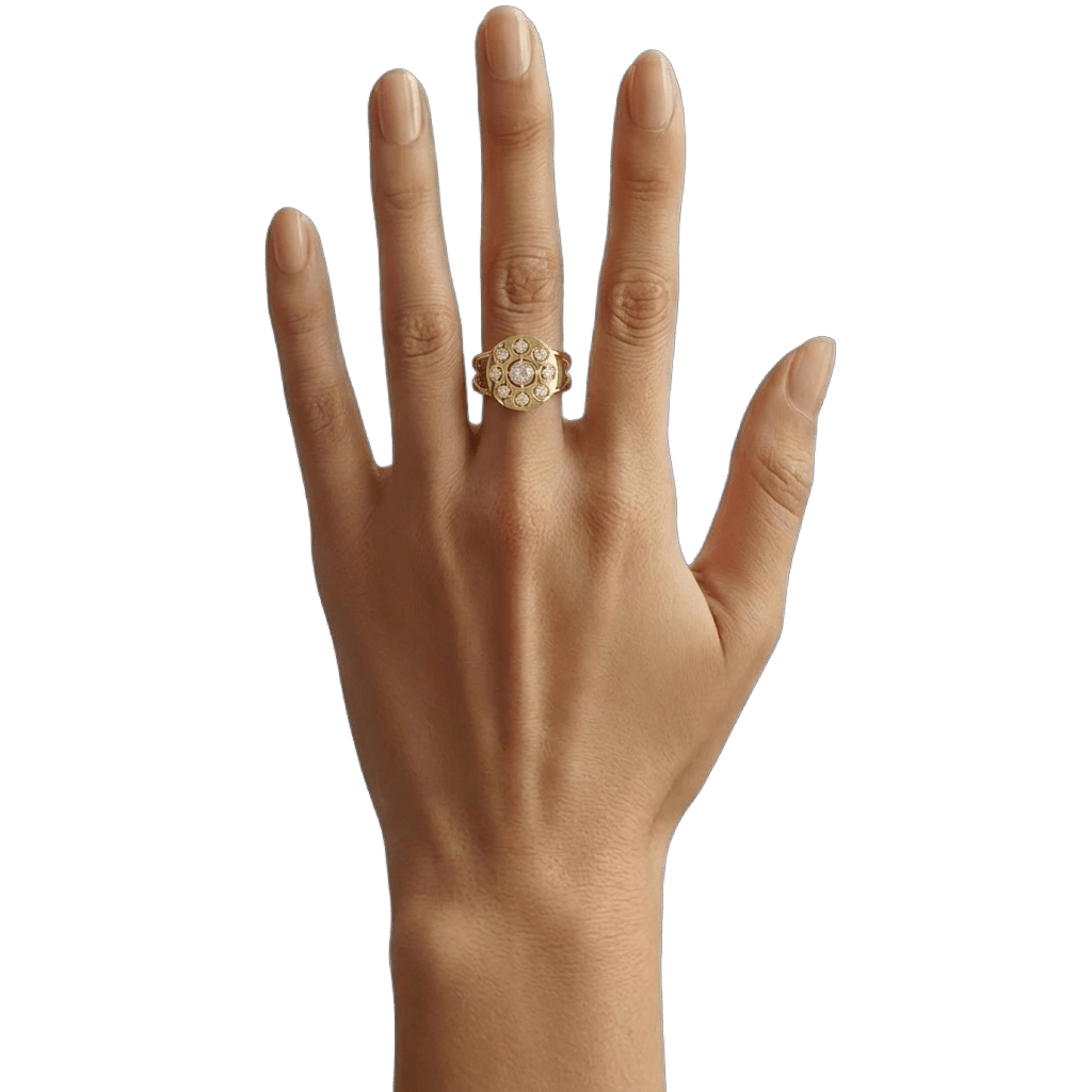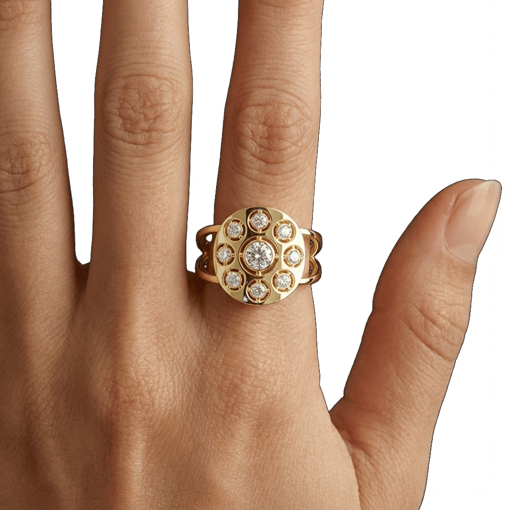 Spécifications : Or 750/1000 2.4gr, Diamant de synthèse Central Rond de 0.22Ct, D, VS+ de diamètre 3.9mm entouré de 8 diamants de synthèse Rond de 0.03Ct de diamètre 2mm soit 0.46Ct total