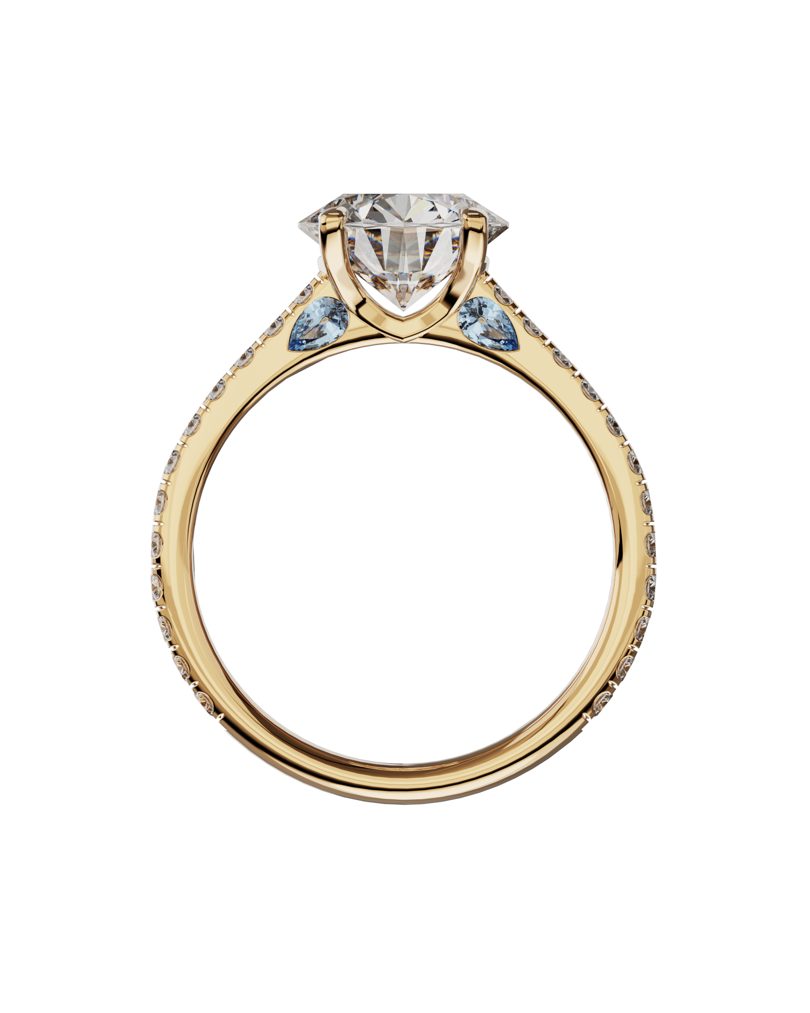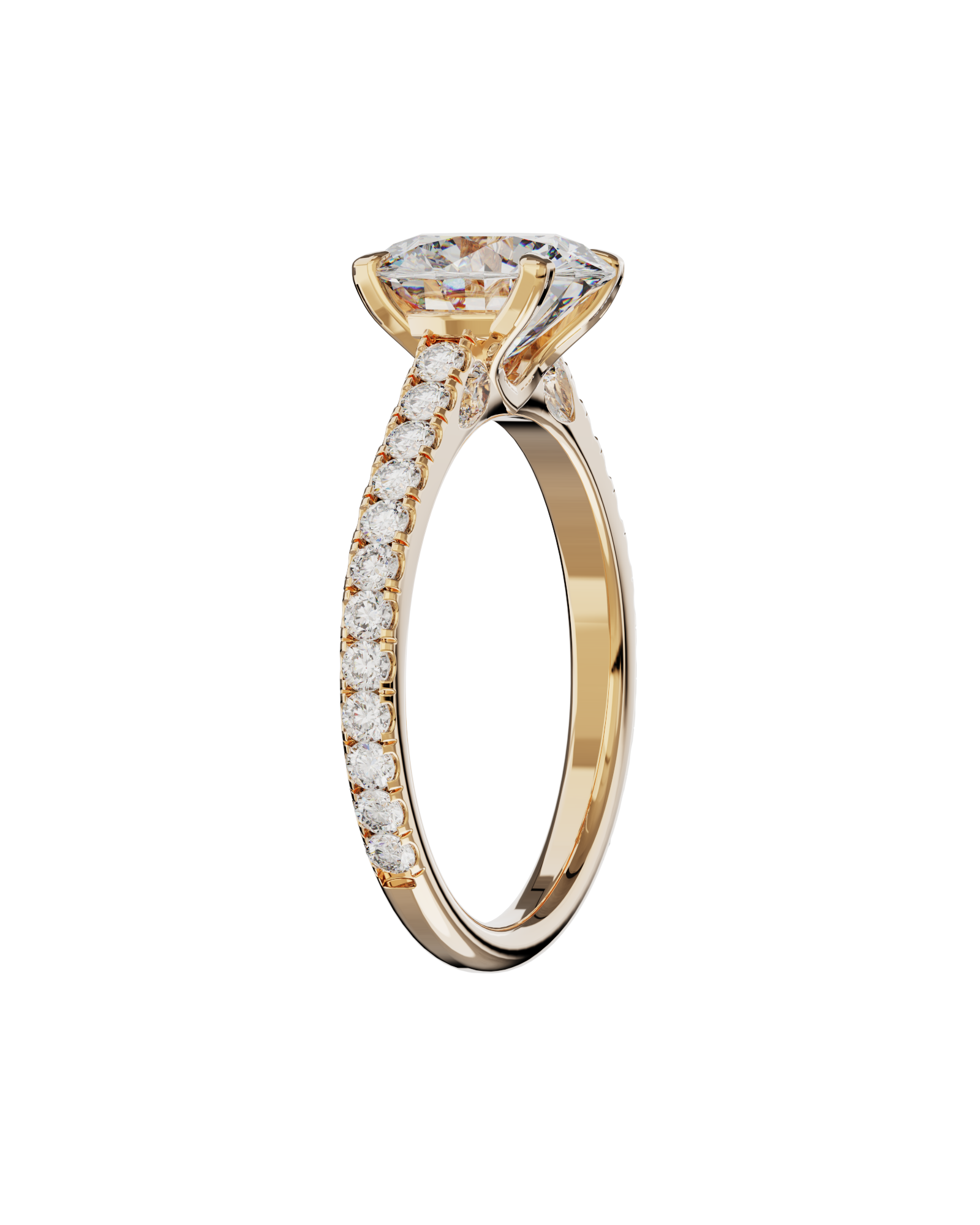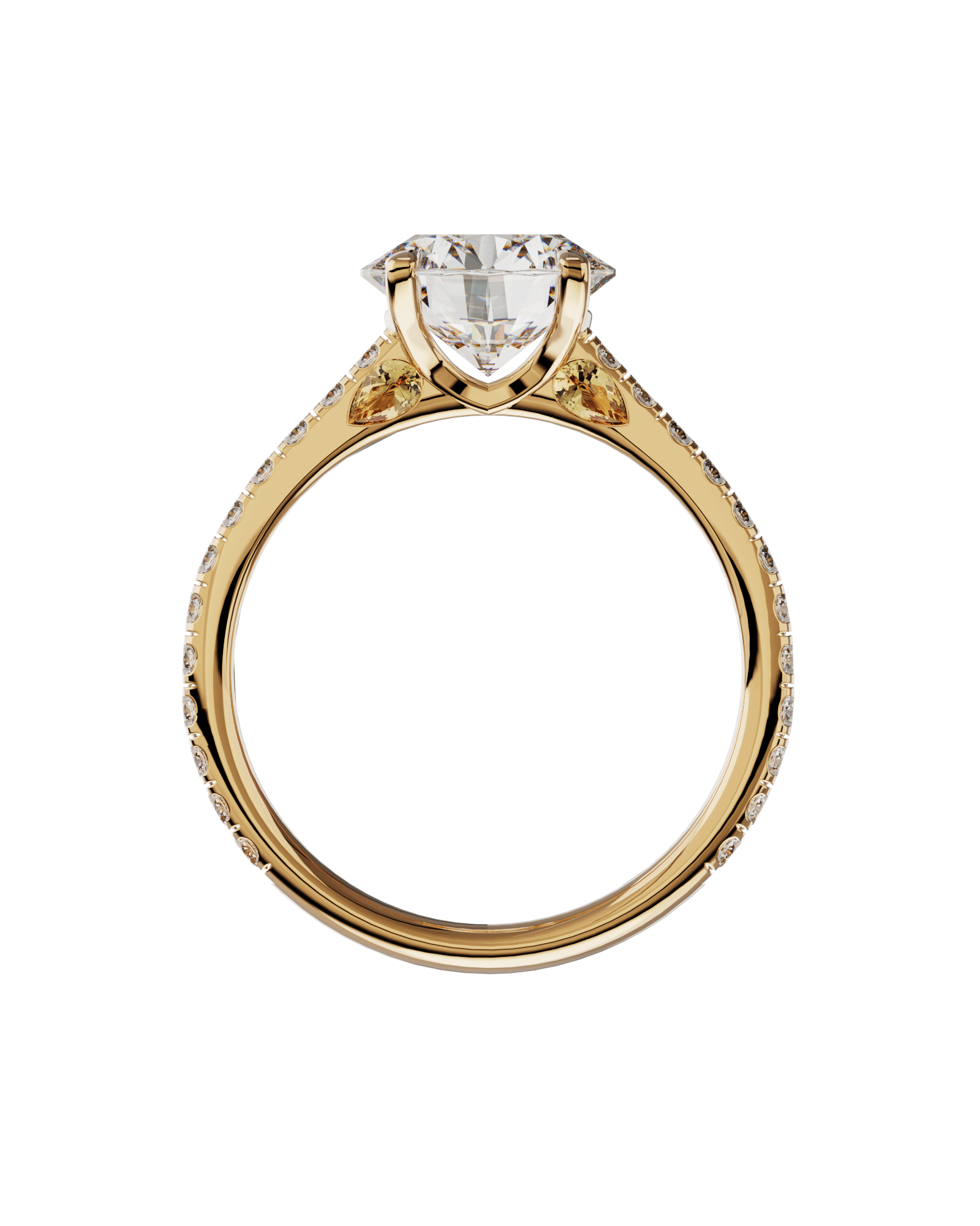 Spécifications : Or 750/1000 3.0gr, Diamant de synthèse Central Rond de 2.0Ct, D, VS+ de diamètre 8.19mm entouré de 4 diamants de synthèse Poire de 0.06Ct et de 22 diamants de synthèse Ronds de 0.022Ct soit 2.72Ct total