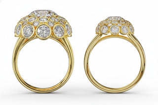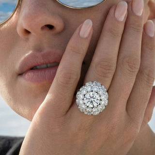 Un dôme-œuf, monumental. Au centre, 3,4 carats. Autour, 36 diamants, 5 carats au total. Une architecture qui recouvre la phalange entière. Éclora capte la lumière de partout. Une pièce sans limite, imposante, audacieuse.