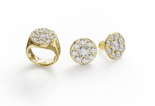 Bague, pendentif, bracelet ou boucles d’oreilles, chaque pièce de la collection Daisy porte la même signature : un disque pavé de 15mm serti de 2,6 carats de diamants.