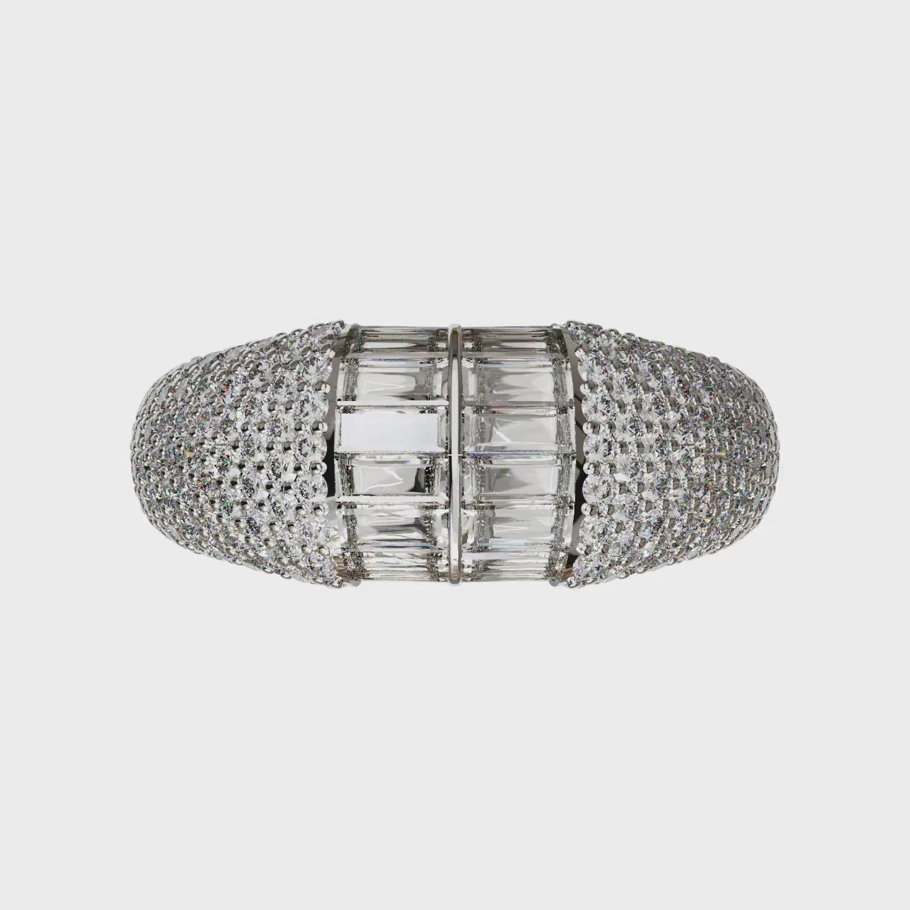 Les diamants baguette tracent une ligne centrale, comme un axe de clarté, entouré d’un pavage serré qui diffuse la lumière jusqu’aux bords. Tout est question d’équilibre, de rythme, de retenue. C’est une bague qui ne cherche pas à séduire par la démesure, mais par la justesse de sa structure “