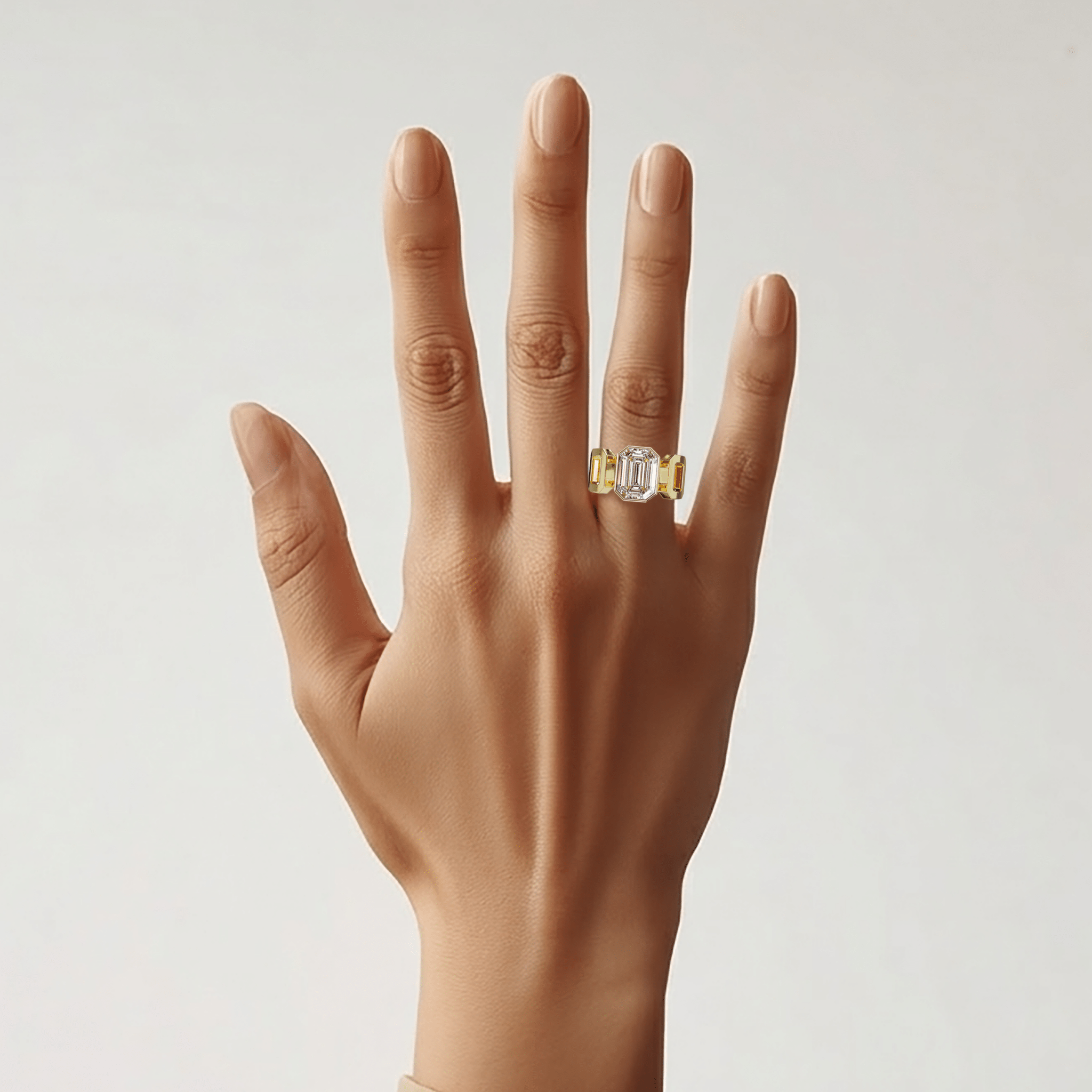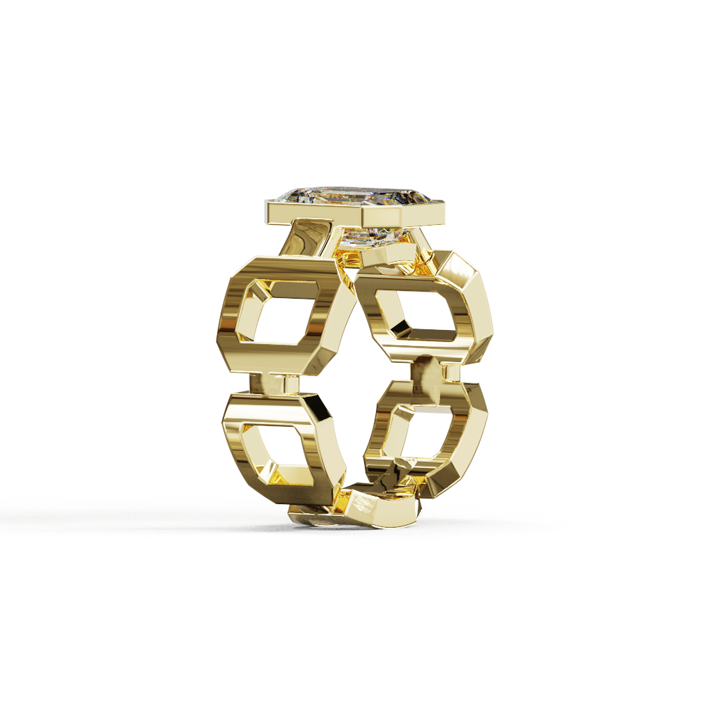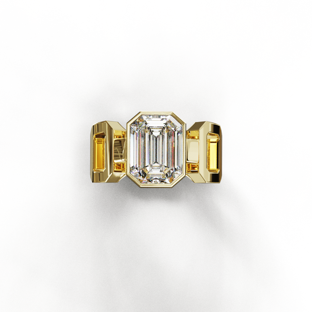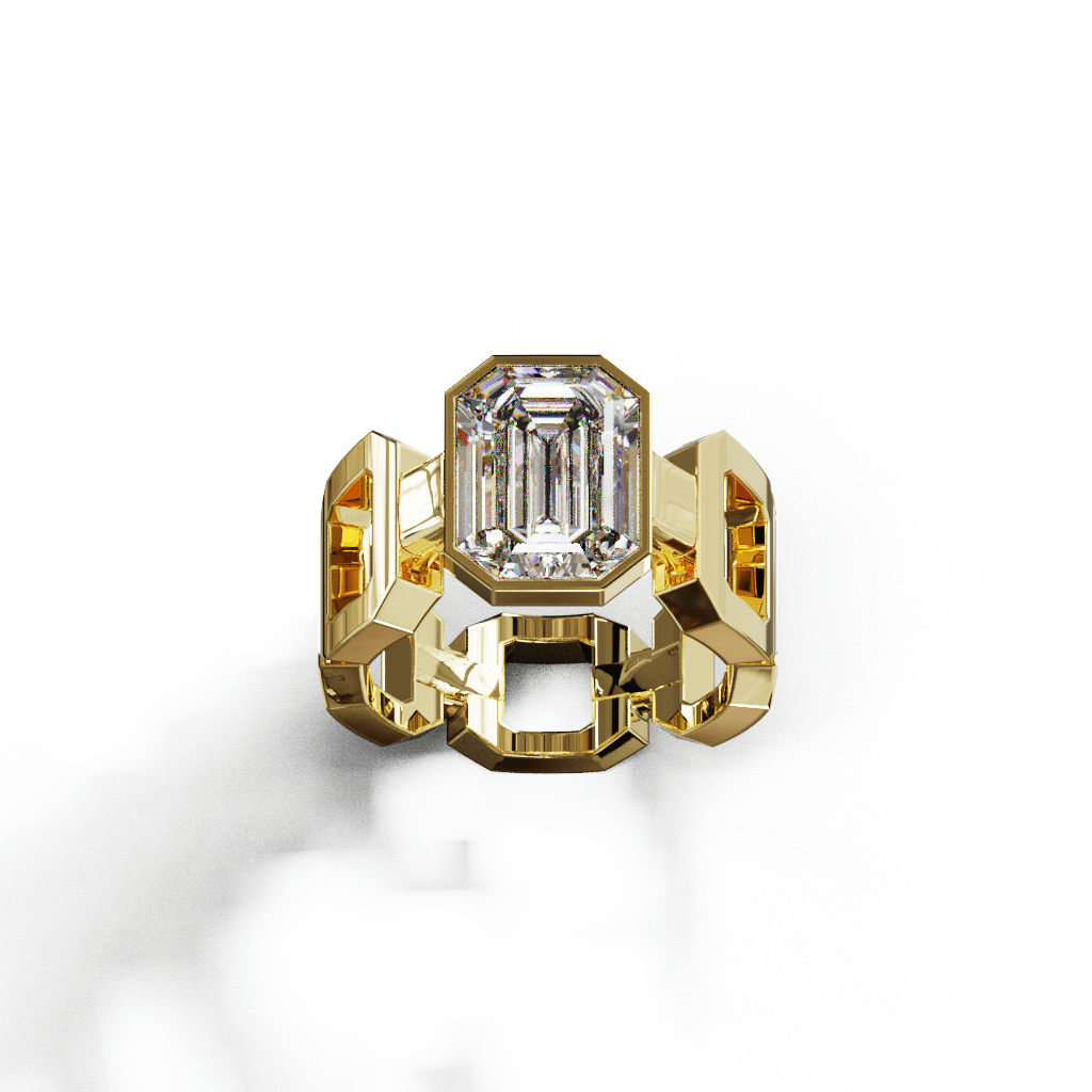 Le design reprend les lignes géométriques de la taille émeraude et les prolonge dans la structure même de la bague.