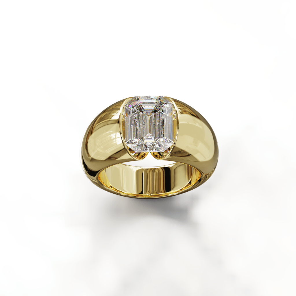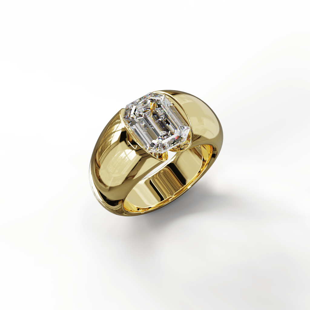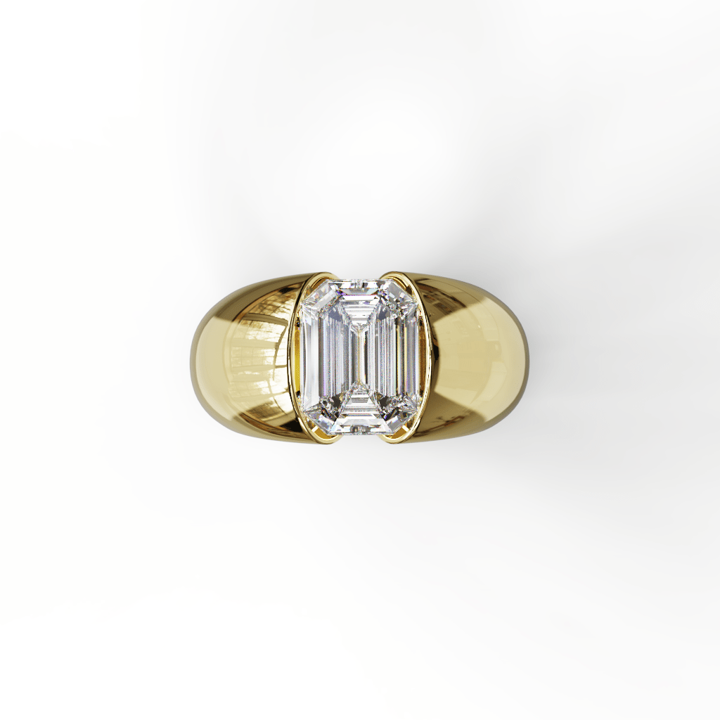 Bague en or jaune au design sculptural et épuré, dont le corps large et bombé enveloppe un diamant taille émeraude.