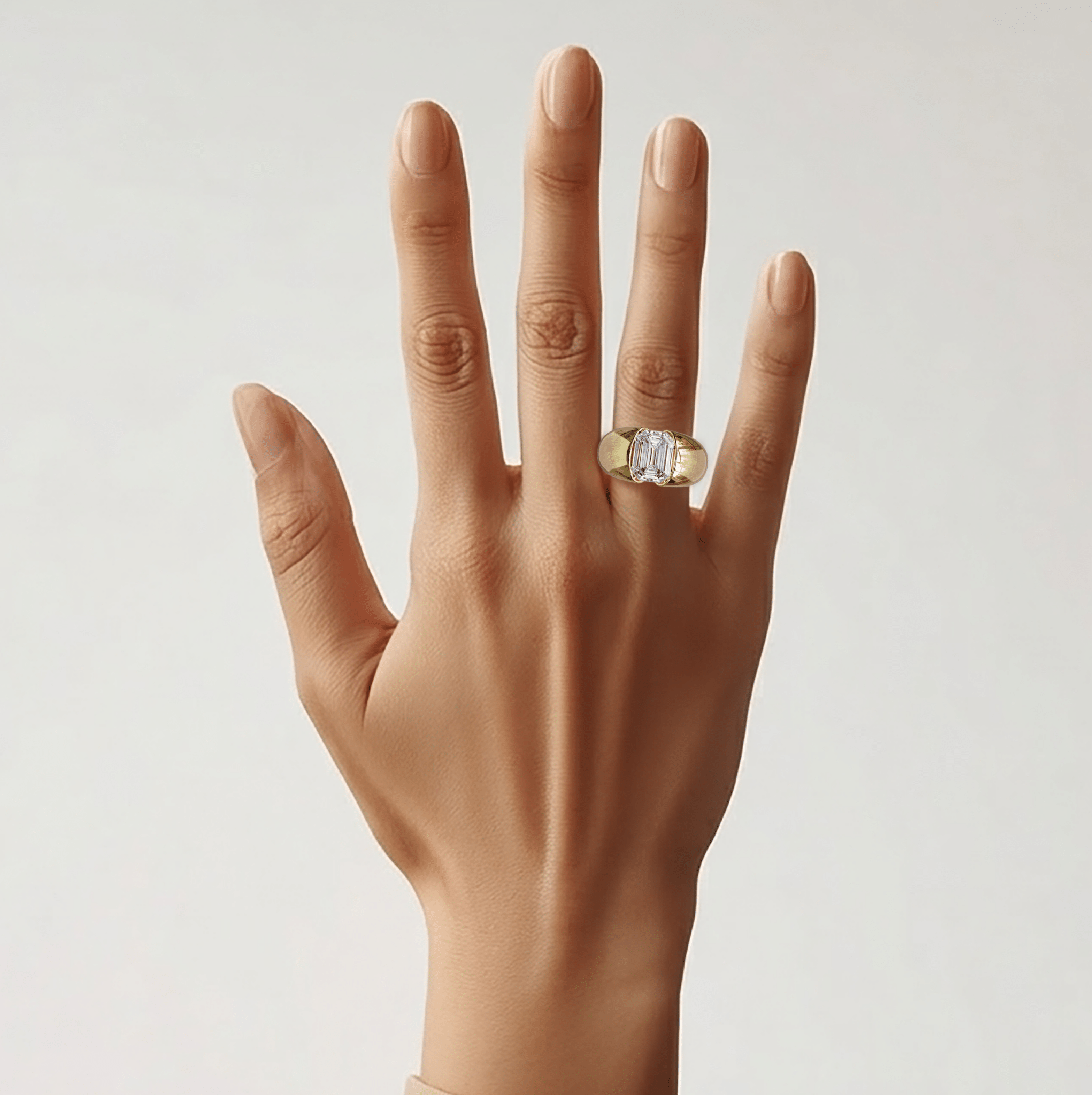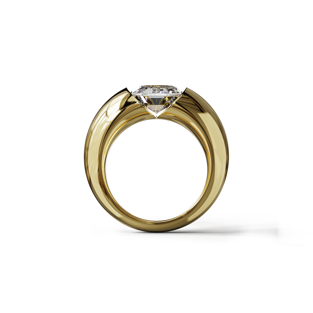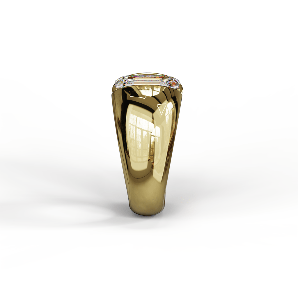 Bague en or jaune au design sculptural et épuré, dont le corps large et bombé enveloppe un diamant taille émeraude.