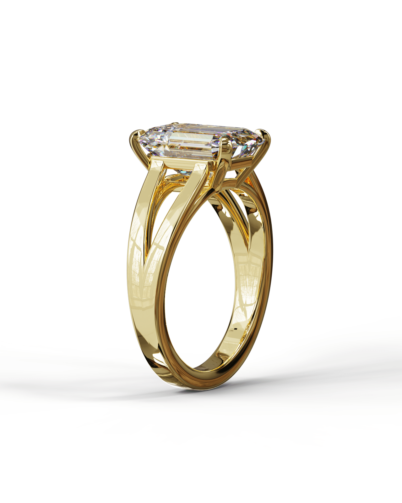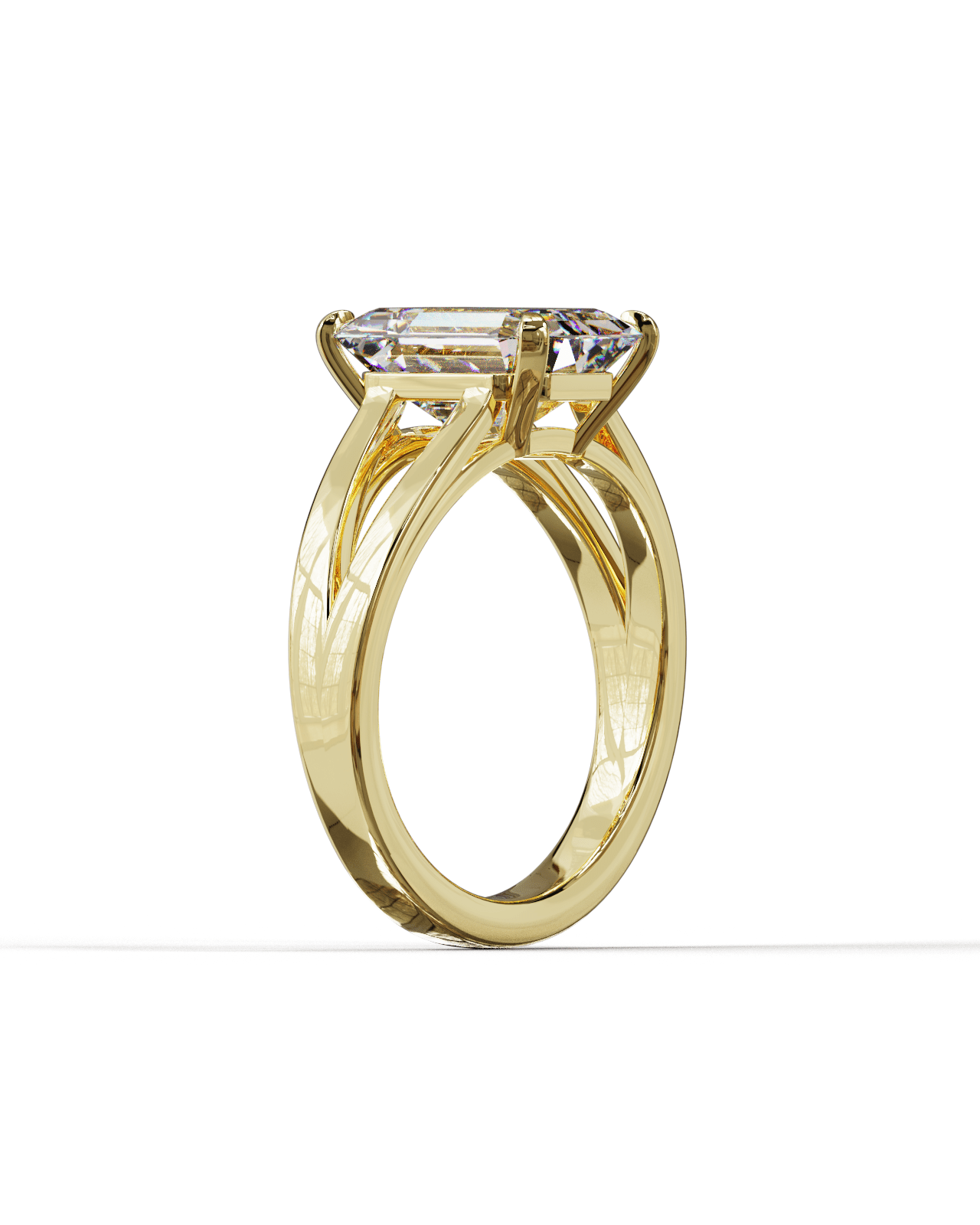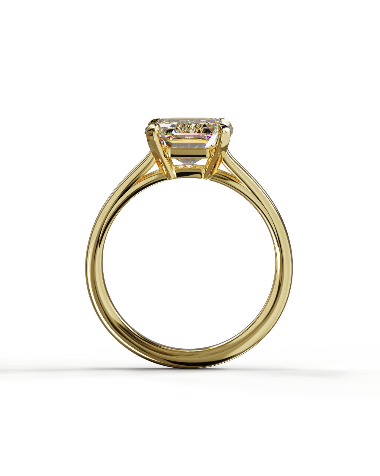 Le corps de bague en or jaune 18 carats se divise en deux lignes qui s’ouvrent sous la pierre, formant une structure équilibrée et ajourée. Vue de profil, la monture laisse apparaître le diamant dans toute sa hauteur, avec une découpe qui permet d’en observer la table et le pavillon. Le dessin met l’accent sur la clarté du diamant et la géométrie de sa taille.