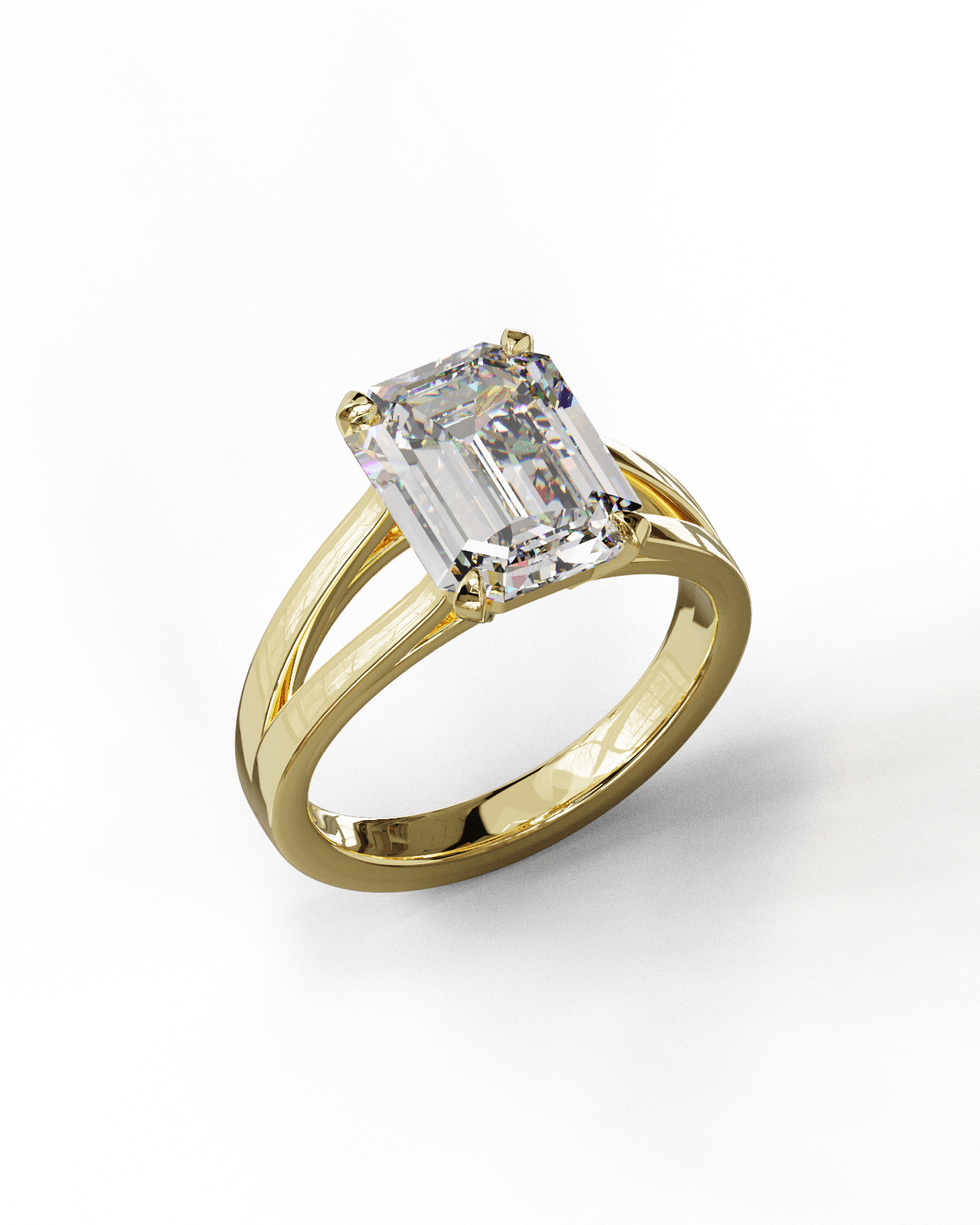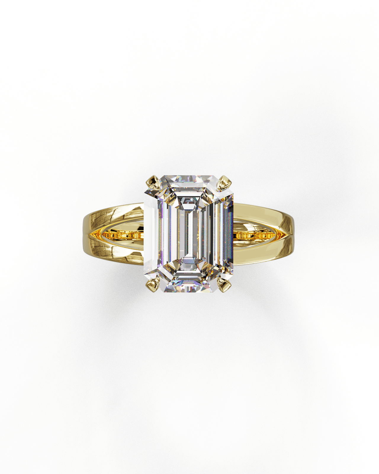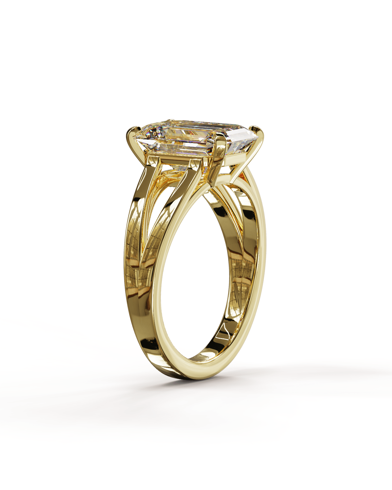 Le corps de bague en or jaune 18 carats se divise en deux lignes qui s’ouvrent sous la pierre, formant une structure équilibrée et ajourée. Vue de profil, la monture laisse apparaître le diamant dans toute sa hauteur, avec une découpe qui permet d’en observer la table et le pavillon. Le dessin met l’accent sur la clarté du diamant et la géométrie de sa taille.