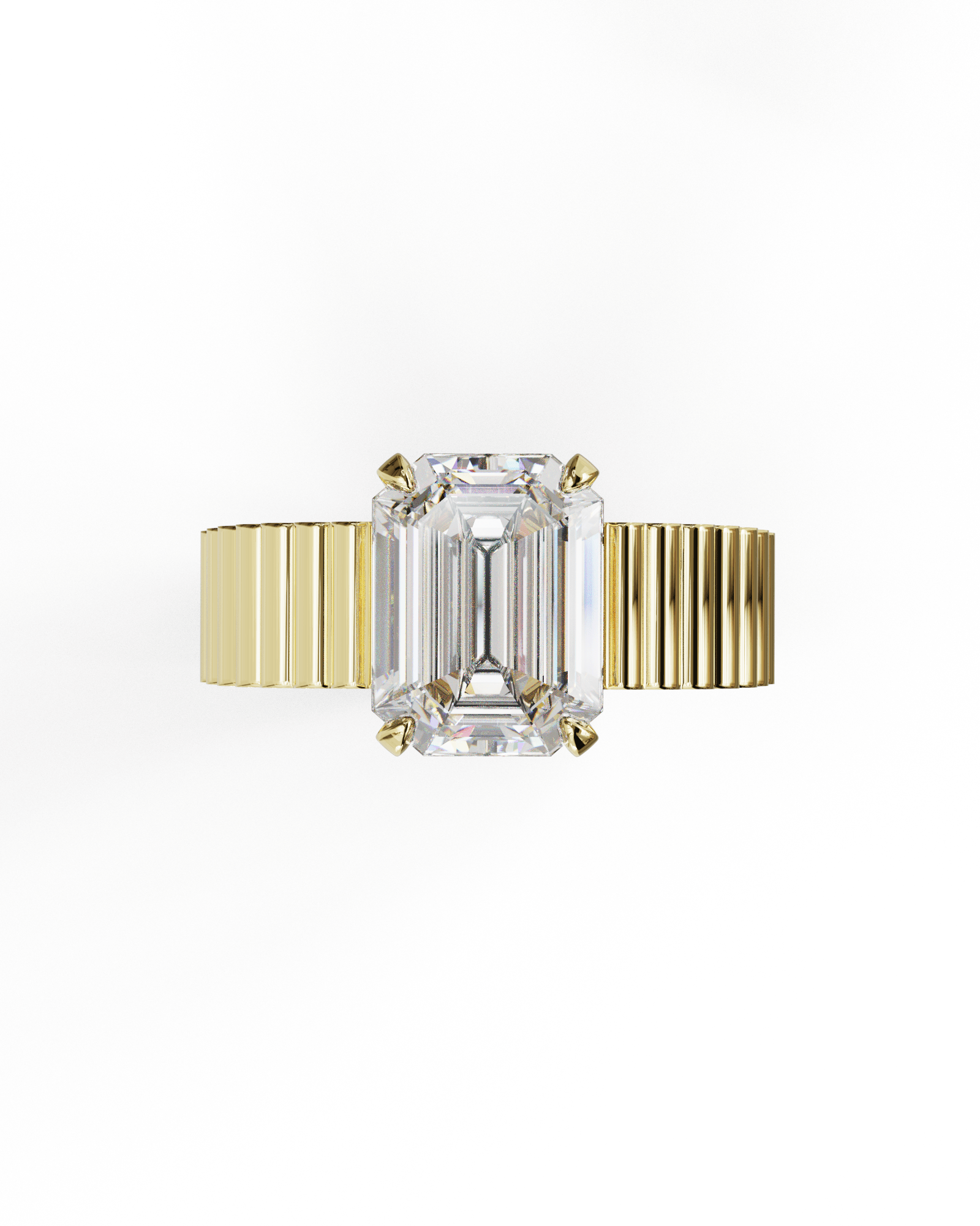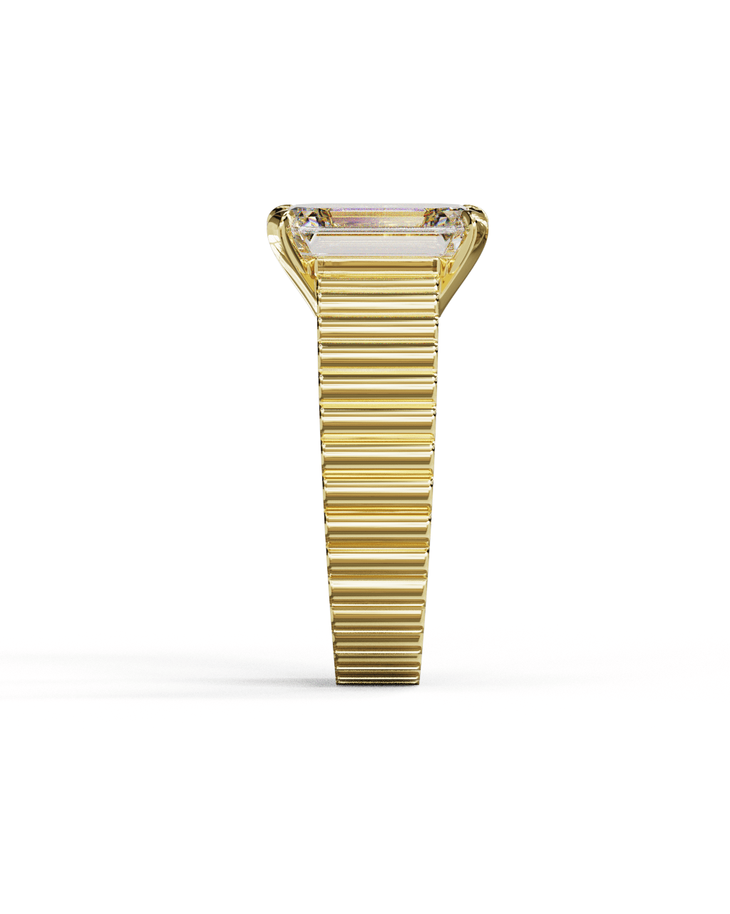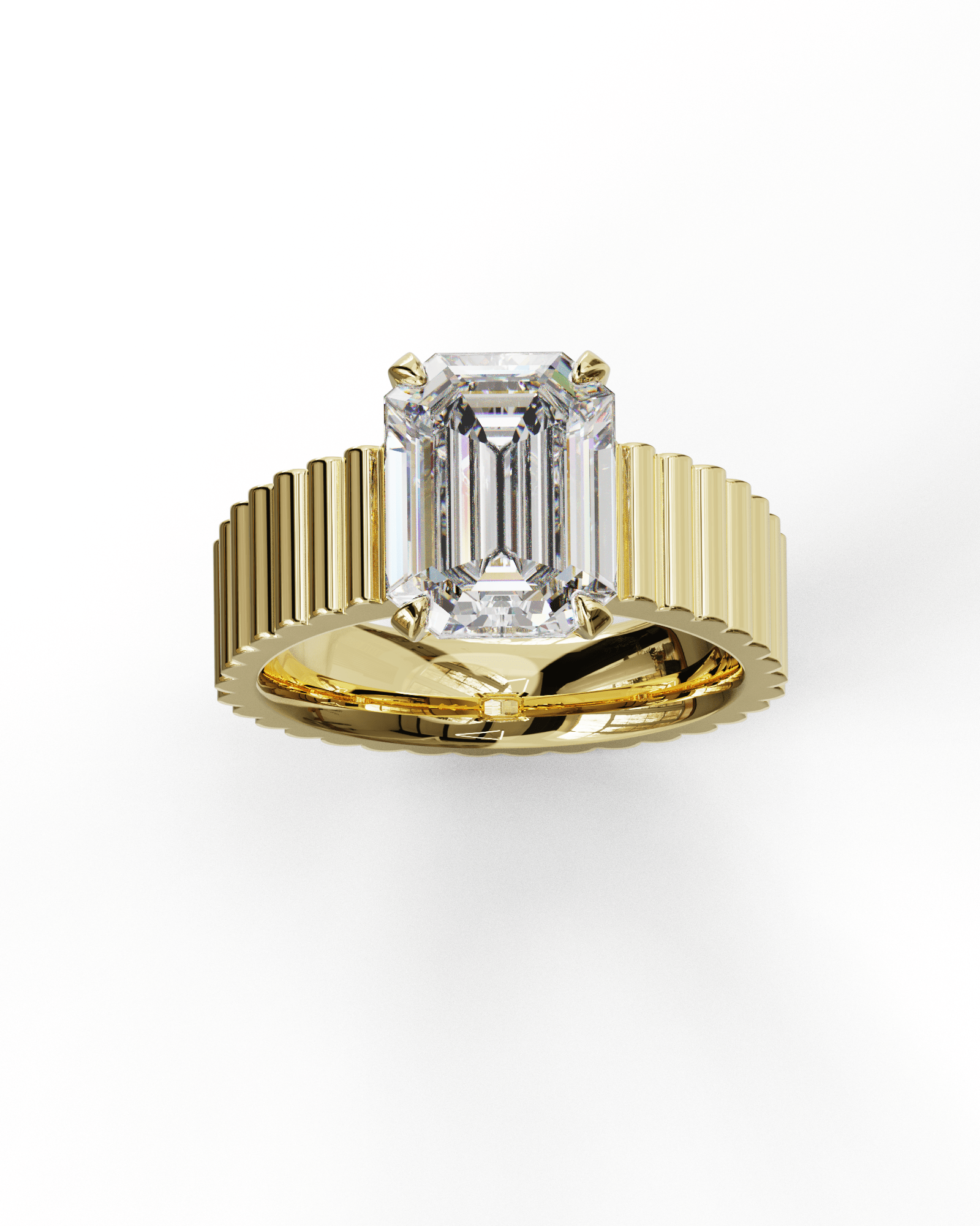 Chaque segment est sculpté dans l’or jaune et parfaitement aligné pour créer une continuité visuelle autour du doigt. La pierre centrale est maintenue par quatre griffes droites, ouvertes pour laisser entrer la lumière sur toute la hauteur de la taille émeraude. Vue de profil, la monture se fond dans la ligne du chaton, soulignant la relation directe entre la géométrie du métal et celle de la pierre.