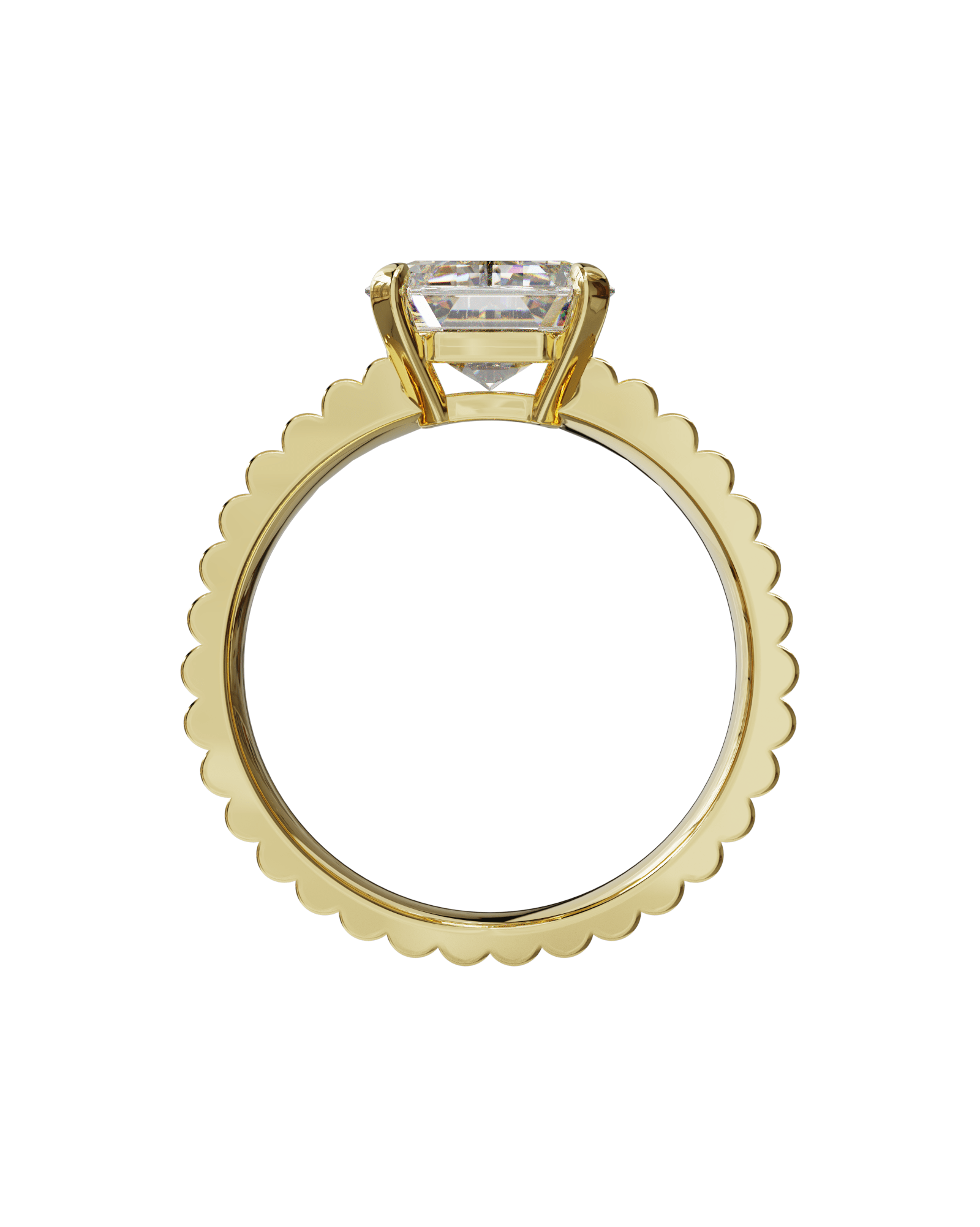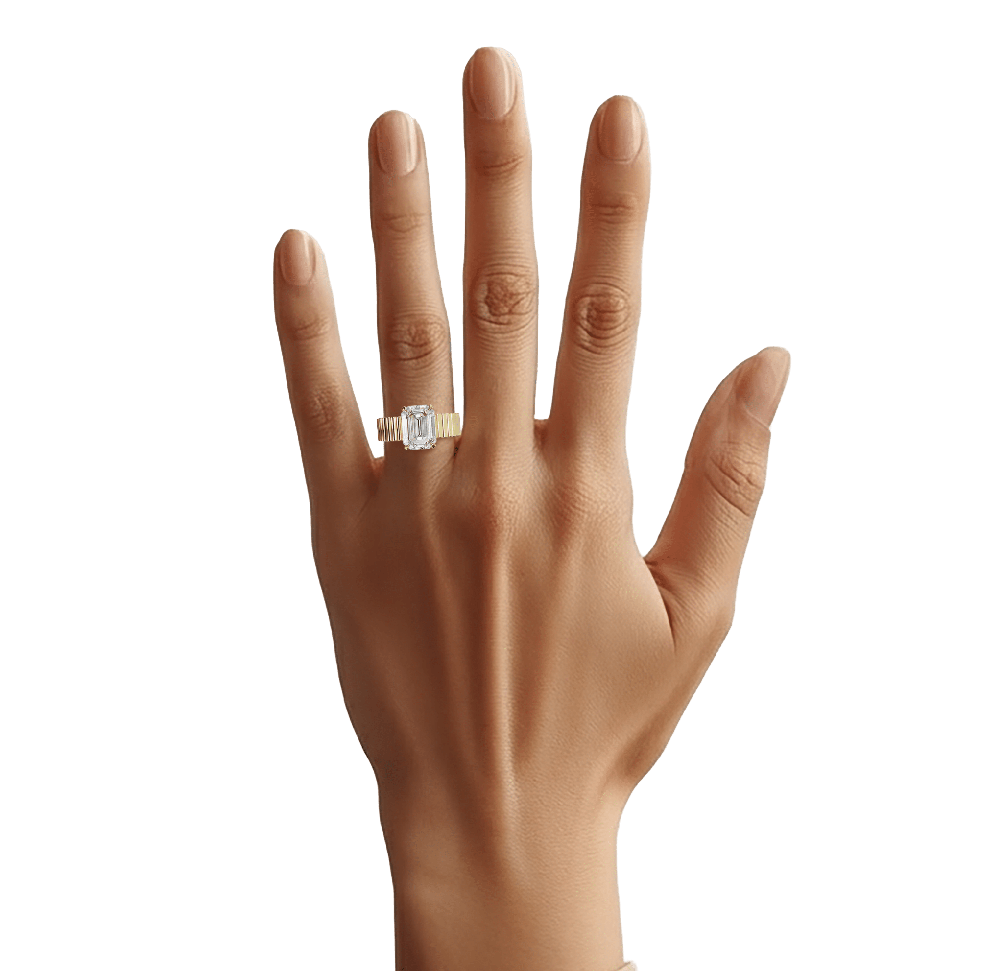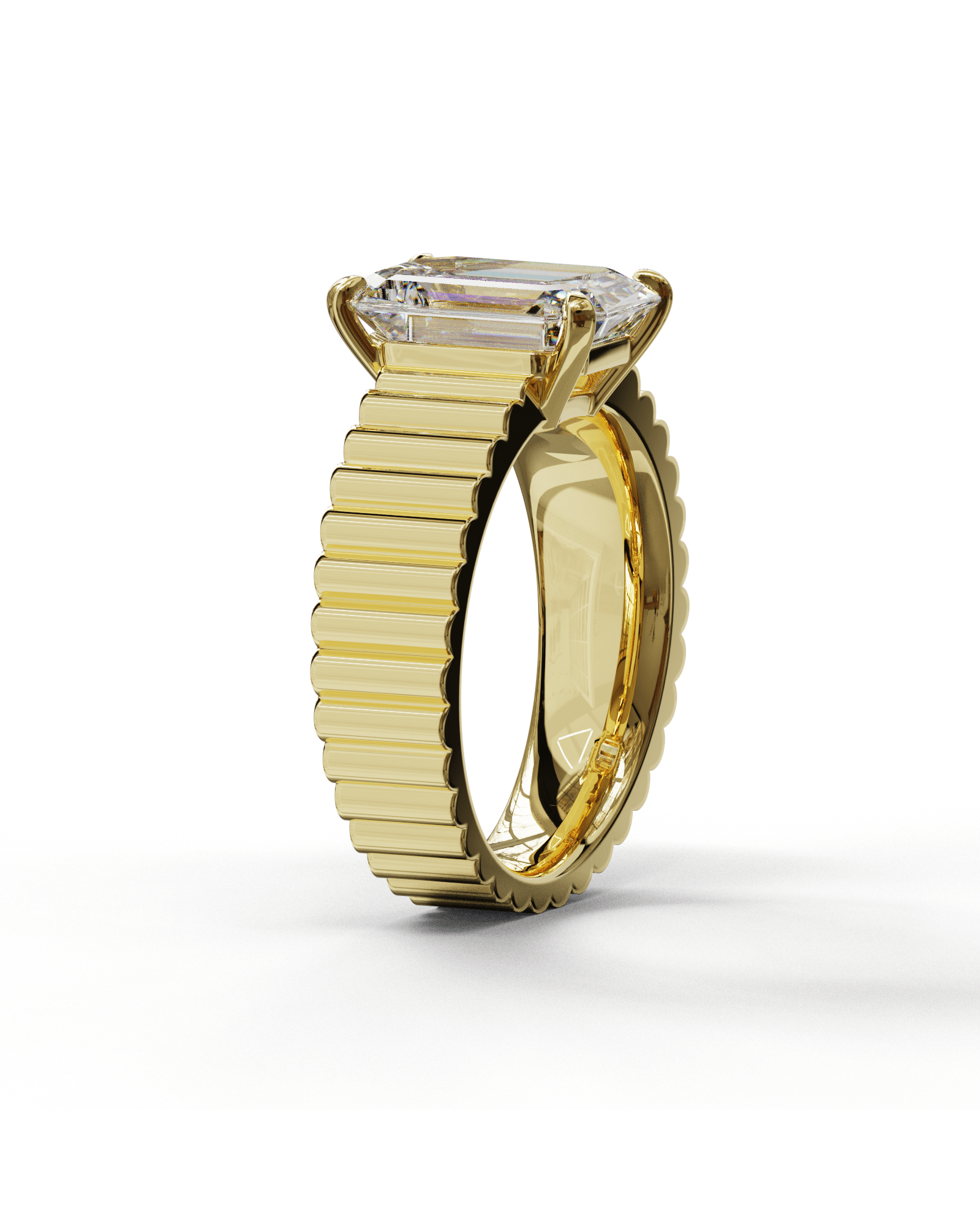 Chaque segment est sculpté dans l’or jaune et parfaitement aligné pour créer une continuité visuelle autour du doigt. La pierre centrale est maintenue par quatre griffes droites, ouvertes pour laisser entrer la lumière sur toute la hauteur de la taille émeraude. Vue de profil, la monture se fond dans la ligne du chaton, soulignant la relation directe entre la géométrie du métal et celle de la pierre.